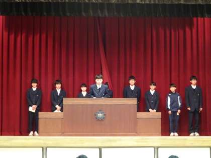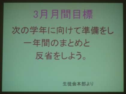 本日、生徒会朝礼を行いました。各専門委会から今年度の反省や申送り事項などが伝えられました。生徒会の月間目標は「次の学年に向けて準備をし一年間のまとめと反省をしよう」です。(遠藤)