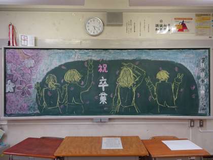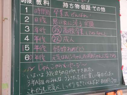 卒業式のあと、3年A組の教室には素敵な黒板アートと60年後までの予定、担任の先生からのメッセージが書かれていました。(遠藤)