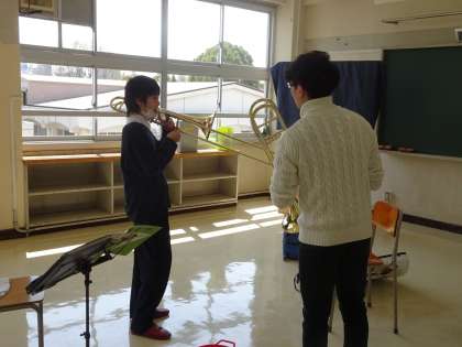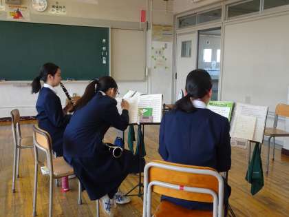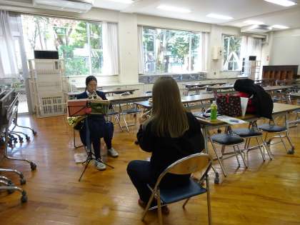 吹奏楽部が活動しています。パート別に分かれての練習です。武蔵野音大の大学生が教えに来てくれているようです。(遠藤)