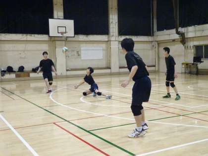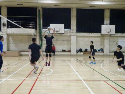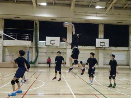 午後の体育館では男子バレーボール部が活動しています。コーチたちを相手に試合形式の練習をしています。(遠藤)