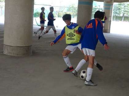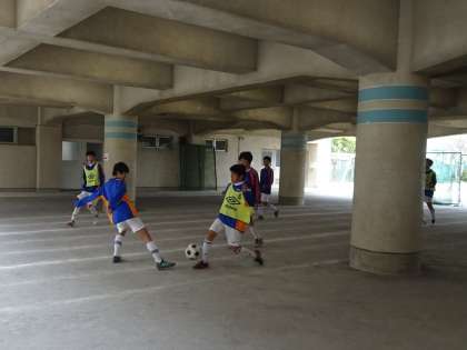 サッカー部が活動しています。雨が降っているのでプール下で練習しています。(遠藤)