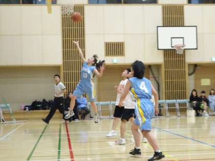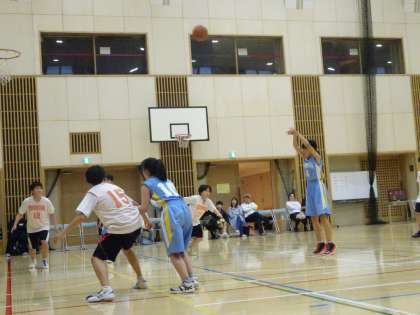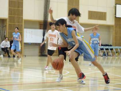 女子バスケットボール部が上原中、佃中と練習試合をしています。スクリーンを使って、マークマンをずらしてボールをつなぎましょう。(遠藤)