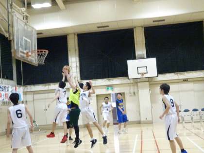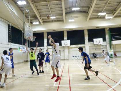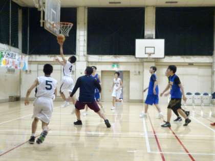 15時から体育館では男子バスケットボール部が活動しています。コーチたちを相手にゲーム形式の練習をしています。(遠藤)
