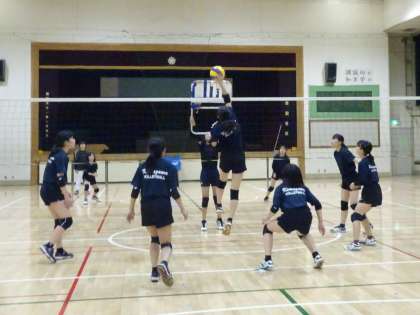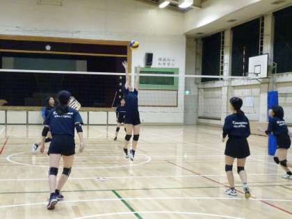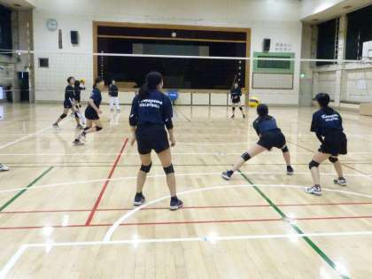 体育館では女子バレーボール部が活動しています。サーブレシーブからトス、スパイクまでの攻撃の練習をしていました。(遠藤)