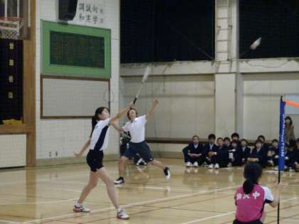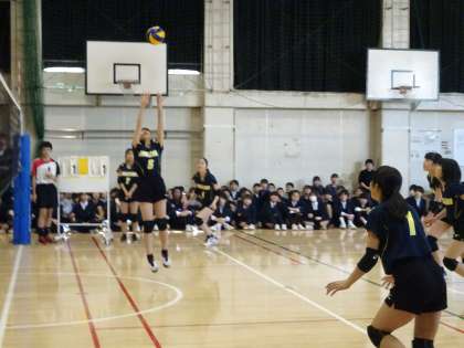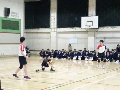 バレーボール部は男女合同での発表です。男子VS女子で試合をしながら紹介をしていました。バドミントン部はシャトルを実際に打ちながらの紹介です。(遠藤)