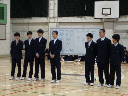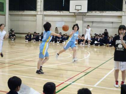 英語部、男女バスケットボール部です。どんな活動をしているか実演しながら紹介しています。(遠藤)