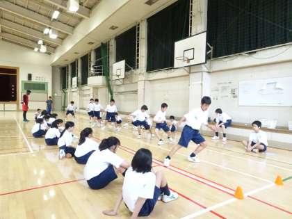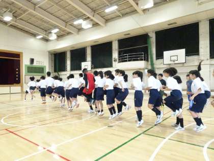 1年生の体育の授業です。反復横飛びの測定をした後、運動会に向けて大縄とびの練習をしえいました。ALTのジェローム先生も一緒に参加しています。(遠藤)