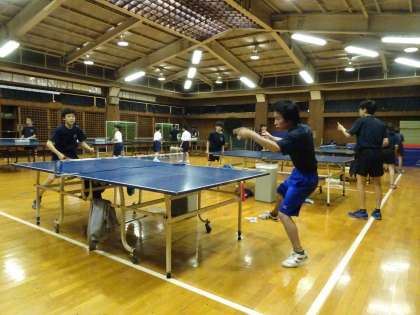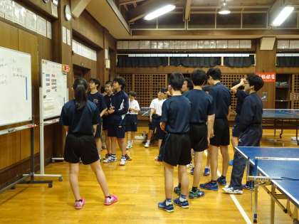 格技室では卓球部が活動しています。練習内容や組み合わせを確認してから練習を始めていました。(遠藤)
