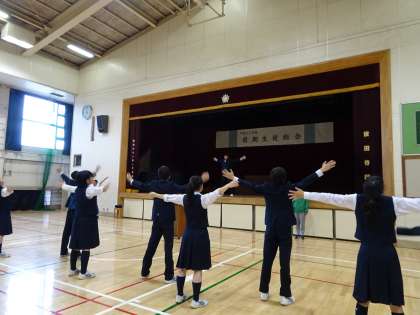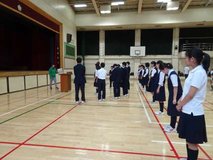 放課後、体育館では体育委員が明日の全校練習のために開閉会式の練習をしています。体育委員が中心となって全校練習を引っ張っていけるようにしておきましょう。(遠藤)