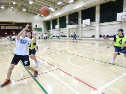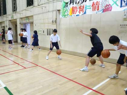 体育館で女子バスケットボール部が活動しています。ボール運びの練習をしています。1年生はドリブル練習をしています。(遠藤)