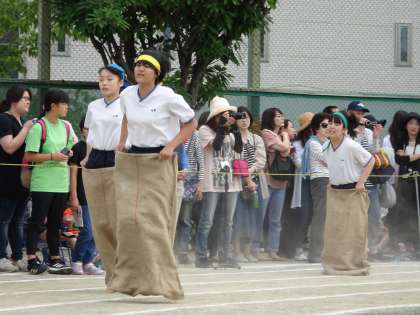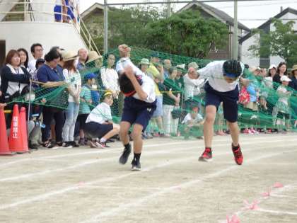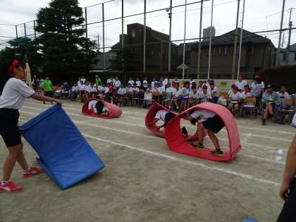 障害物競争です。キャタピラ、ゴムハードル、袋ジャンプ、ネットの順にクリアしゴールをめざします。(遠藤)