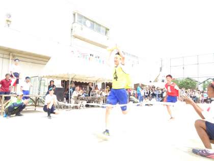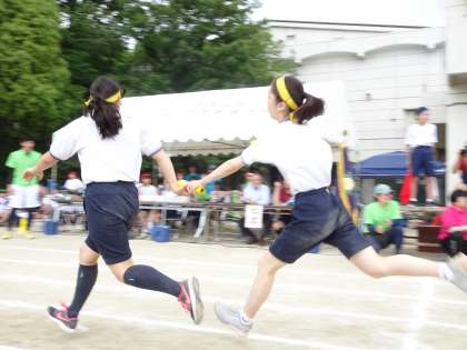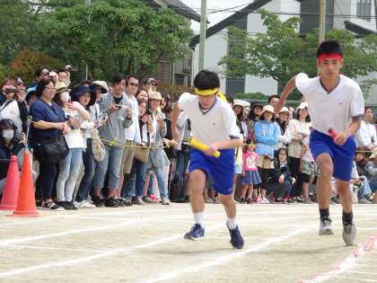 全員リレーの様子です。第一走者からアンカーまで、クラス全員の思いをバトンでつなぎ、どのクラスよりも先にゴールテープを切ることをめざしてがんばっています。(遠藤)