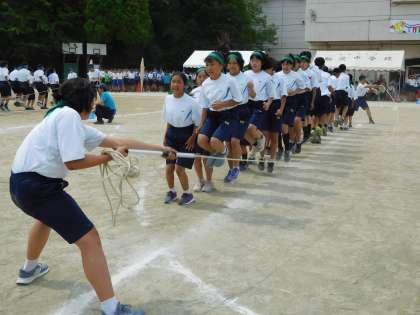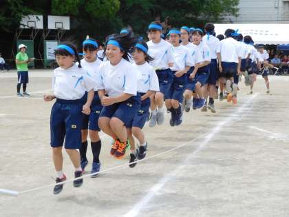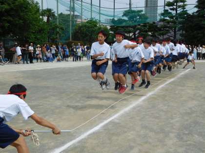 1年生の大縄跳びです。ロープの回し手とジャンプをするクラス全員の気持ちを一つにして失敗しても気を取り直し協力して回数を伸ばしています。(遠藤)