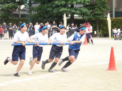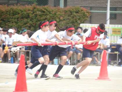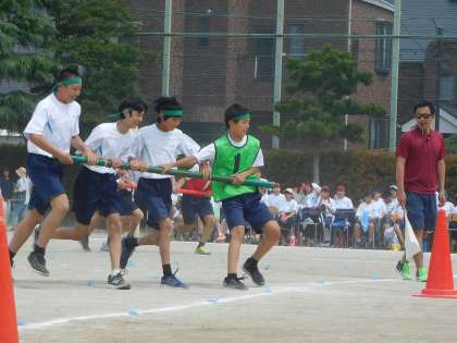 2年生のハリケーンのです。4人で力を合わせ3つのコーンを回って戻ってきます。戻ってきたらクラス全員で協力して竹の棒を飛び越えなければなりません。クラスの団結力が試されます。(遠藤)
