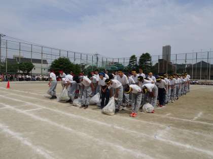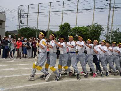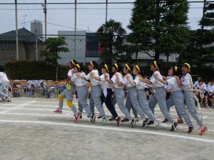 3年生の大むかで競走です。女子から男子へ襷をつなぐリレー方式のレースです。全員の気持ちと声と足をそろえてゴールをめざしましょう。(遠藤)