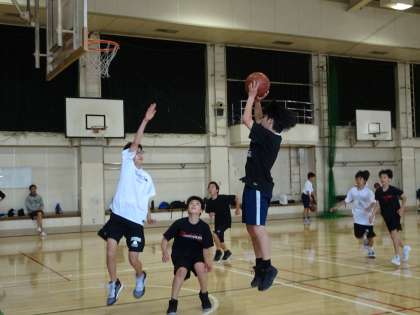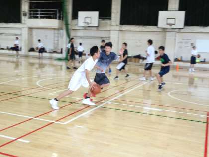 午前中の体育館では男子バスケットボール部が活動中です。3対3をやっています。集中して、いい雰囲気練習しています。(遠藤)