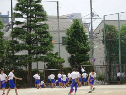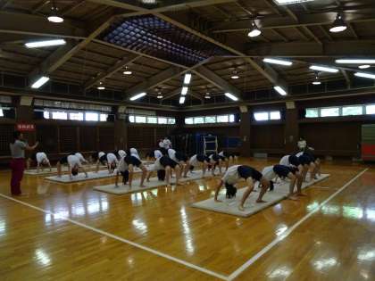 3年生の体育の授業の様子です。男子は校庭でハンドボール投げや懸垂の測定をしていました。女子は格技室でマット運動です。(遠藤)