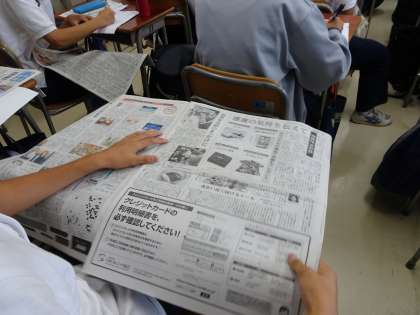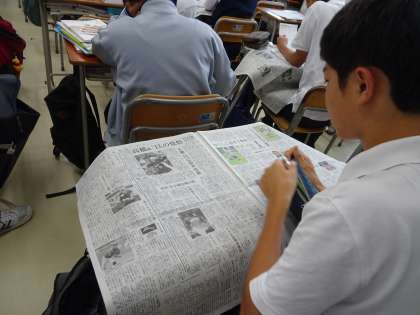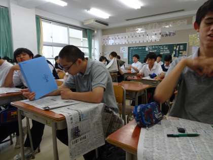 土曜授業の朝はNIEタイムです。今日は毎日新聞を読んでいます。職員室前のNIEコーナーには他社の新聞も置かれています。同じ記事を読み比べてみましょう。(遠藤)