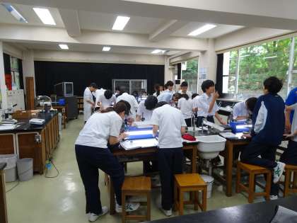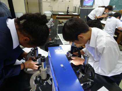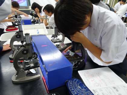 1年生の理科の授業の様子です。理科室でホウセンカとトウモロコシの茎の観察をしていました。(遠藤)