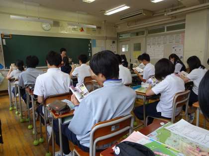 放課後、3年生は修学旅行のコース係の係会を行っています。奈良と京都、それぞれの班行動の計画の立て方を説明しました。(遠藤)