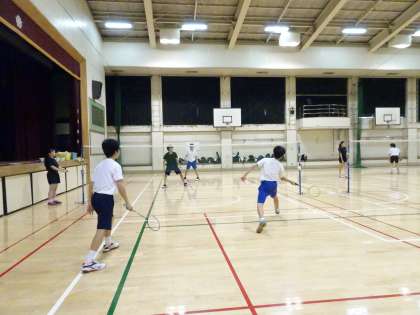 週末から夏季大会が始まるため、期末考査期間中ですがバドミントン部が活動しています。シングルスとダブルスに分かれて練習しています。(遠藤)