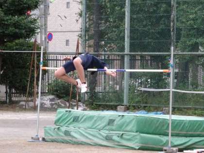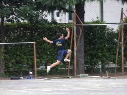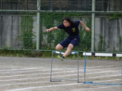 陸上競技部が校庭で活動しています。ハードル走、走り高跳び、走り幅跳びの練習をしていました。(遠藤)
