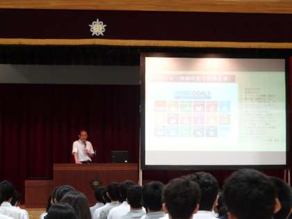 本日、全校朝礼を行いました。校長先生から「SDGs 持続可能な開発目標」について話がありました。(遠藤)