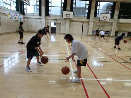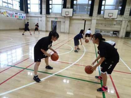 女子バスケットボール部が体育館で活動しています。新チームになり本格的に練習が始まりました。ボールを扱う基本的な練習をしています。(遠藤)