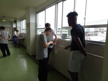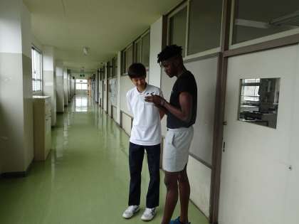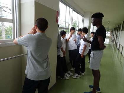 昼休み、3年D組の廊下ではALTのジェローム先生と英語でコミュニケーションを取りながら、数字当てゲームをしていました。積極的にコミュニケーションをとって、ネイティブの英語を聞いて英語力の向上につなげましょう。(遠藤)