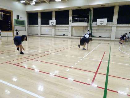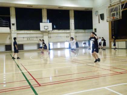 午後の体育館では女子バスケットボール部が活動しています。フットワークはディフェンスの基本です。腰を低くして手をあげて行いましょう。(遠藤)