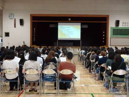 本日、保護者会を行いました。体育館での全体会の様子です。(遠藤)