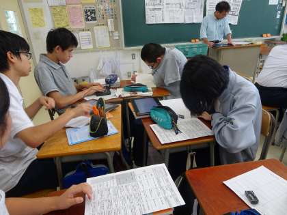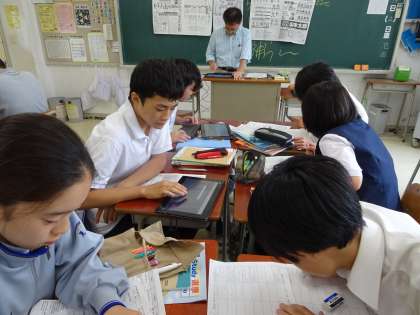 3年生の社会の授業です。班で分担しダブレットPCを使って参議院議員選挙に向けて、各政党の政策を調べていました。(遠藤)