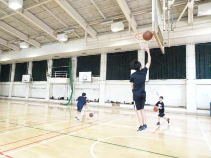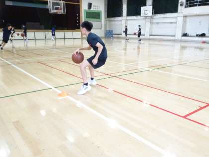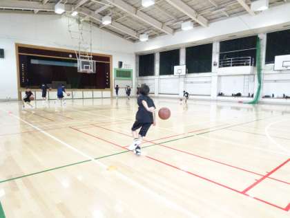 午後の体育館では男子バスケットボール部が活動しています。ドリブル練習をしています。バックチェンジ、レッグスルー、ロールターンなど使って切り返しをしましょう。(遠藤)