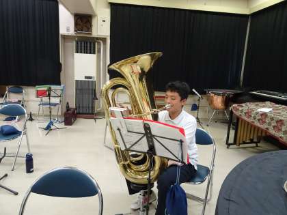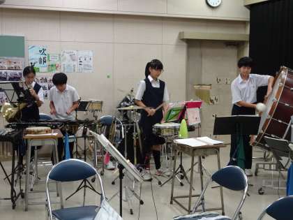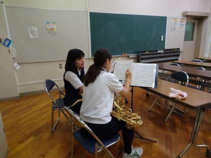 吹奏楽部が活動中です。先輩からのアドバイスを楽譜に書き込みながら練習しています。(遠藤)