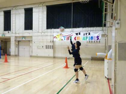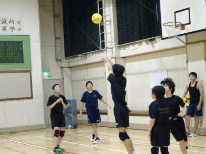 体育館ではバレーボール部が活動しています。女子はサーブ練習をしていました。男て子は2kgのメディシンボールを使ってトレーニングをしていました。(遠藤)