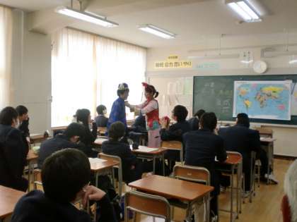 卒業を目前にして、三年生は海外への視野を広げるため、(財)国際教育映像協会の「留学生が先生!」教育プログラムを活用して、国際理解教室を開催しました。イタリア、中国、ブラジルからの3名の留学生が来校してくださり、母国の文化、歴史、自然、風習、生活などについて、具体的にお話ししてくれました。民族衣装や楽器、写真などを持参してくれて、生徒も熱心かつ和やかに聞いていました。交通事情の悪い中ありがとうございました。
