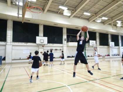 15時から体育館ではバスケットボール部が活動しています。男子はリバウンドシュートの練習です。女子はディフェンスフットワークをやっています。(遠藤)