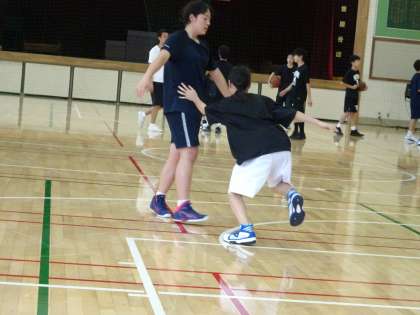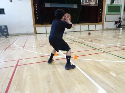 午後の体育館ではバスケットボール部が活動しています。ディフェンスフットワークやドライブの練習です。インステップやアウトステップできちんとミートをしましょう。(遠藤)