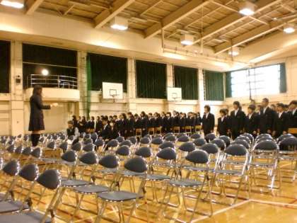 本日、卒業式の予行を行いました。二年生はインフルエンザ罹患者が多いので、大事をとって教室で別行動となりました。1・3年生での予行となりました。また、体育優良生徒(男女各1名)、産業教育振興会賞(男女各1名)、三年間皆勤生徒表彰(6名)の表彰とPTA会長から卒業記念品(卒業証書ホルダー)の贈呈式がありました。1時間目の三年生の式練習の席上で、同窓会長が同窓会幹事任命状の交付(各クラス男女各1名)と卒業記念品(印鑑)の贈呈を行いました。