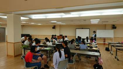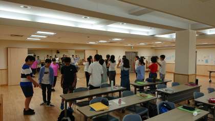 3回目の研修会は、カジュアルデースタイルです。最初に、2013年派遣団の先輩から貴重な体験談を聴きました。参考になりましたね。英会話レッスンに続いて、本日のメインはアトラクション練習です。ダンスを最後まで通すことが目標なので、リーダー中心にがんばっています。(桝田)