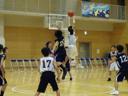 男子バスケットボール部は世田谷中と練習試合をしています。コート内で必要な声を出し攻守の切り換え切りかえをすばやくできるようにしましょう。(遠藤)