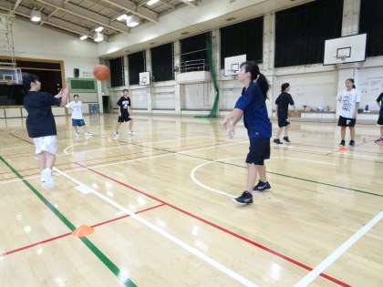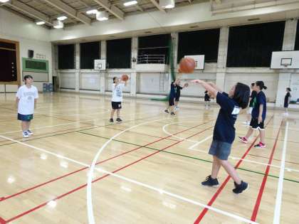 女子バスケットボール部が体育館で活動しています。パスの練習をしています。一つひとつのプレーをていねいに行い、正しいフォームを身につけましょう。(遠藤)