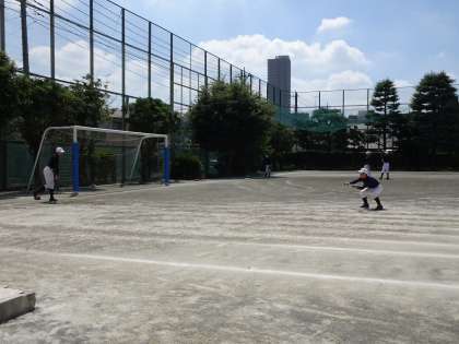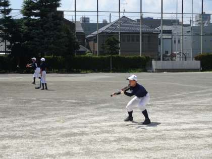 校庭では野球部が活動しています。バント練習をしています。バットのヘッドが下がらないように、膝を使って低いボールに対応しましょう。(遠藤)