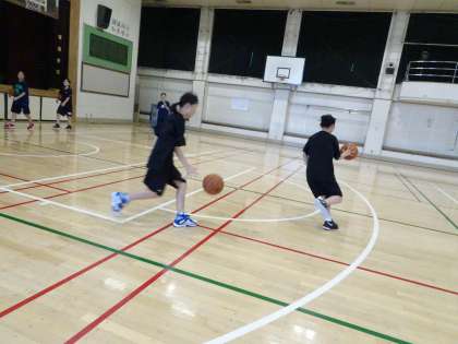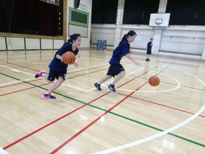 体育館では女子バスケットボール部が活動しています。ドリブルの練習です。低く強いドリブルがつけるように練習しましょう。(遠藤)