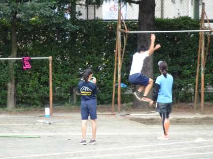 陸上競技部が校庭で活動しています。それぞれの種目に分かれて練習をしていました。(遠藤)