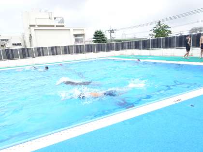 今日から授業が始まっています。3年CD組の体育は水泳をやっていました。男子はクロールの50mのタイムを計測しています。女子はビート板を使って泳いでいました。(遠藤)