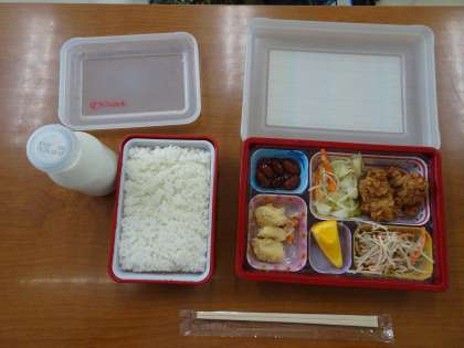 今日から給食が始まりました。9月からは弁当給食にまります。今日の献立は油淋鶏、ジャガイモのそぼろ煮、ごぼうサラダ、金時豆等です。これまでよりも準備の時間が短くなり、食べる時間を多くとることができました。(遠藤)