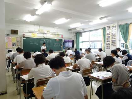 本日、3年生は学習習得確認調査です。国語、数学、英語、社会、理科の順に5科のテストが行われます。進路相談の資料にもなる大切なテストです。夏休みの学習の成果を発揮できるようにがんばりましょう。(遠藤)