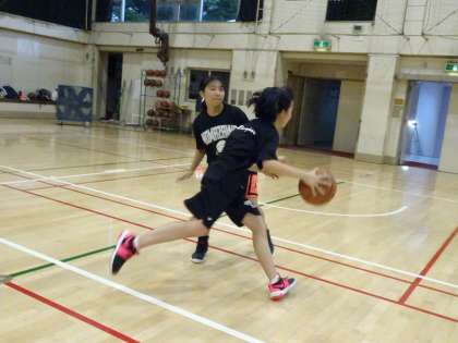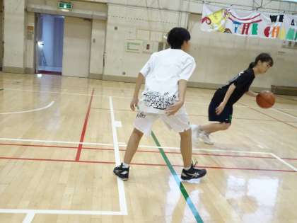 体育館で女子バスケットボール部が活動しています。1対1の練習をしています。(遠藤)