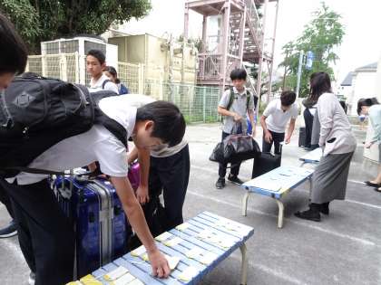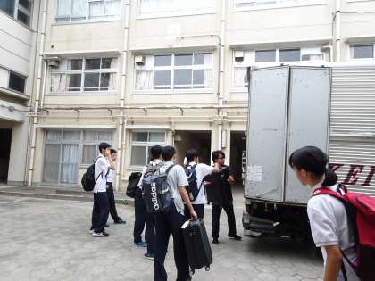 朝7:30〜8:00の間に、3年生は修学旅行の大きな荷物をトラックに積み込みました。(遠藤)